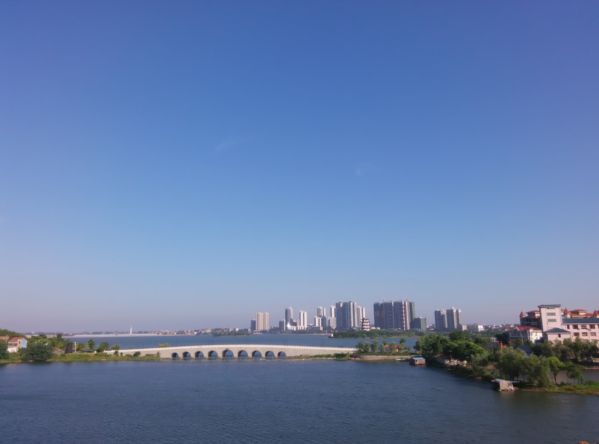 A peaceful view of a stone arched bridge spanning a calm lake, with a modern city skyline rising under a clear blue sky.