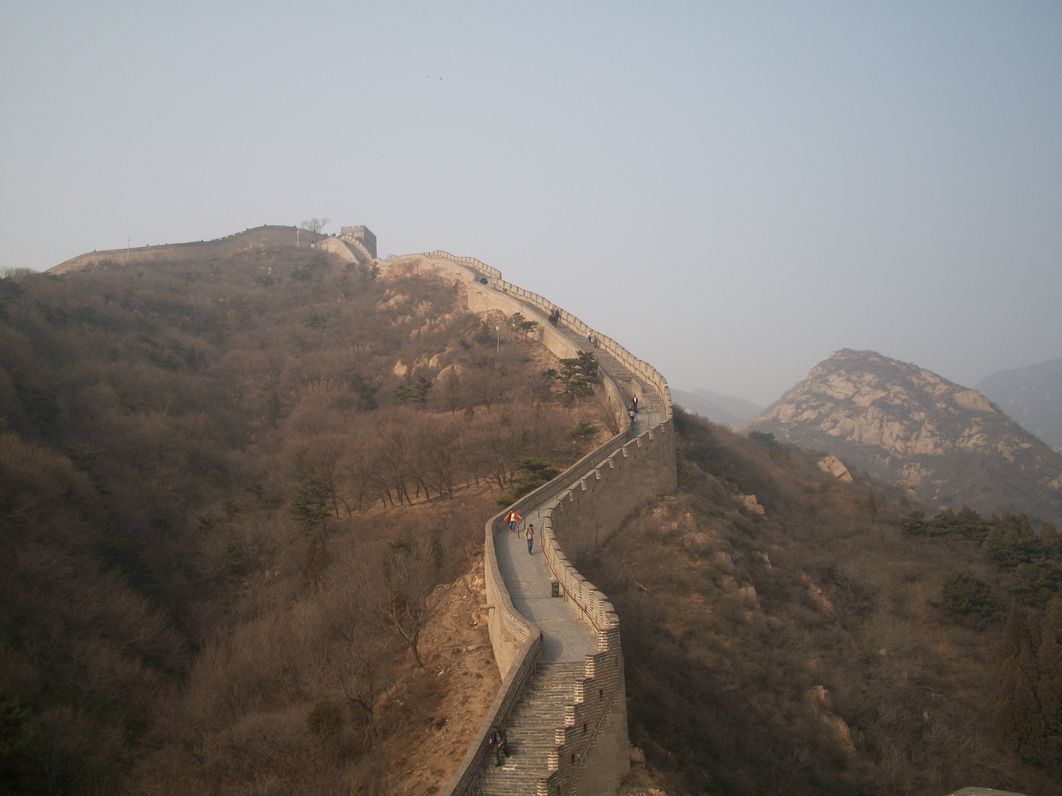 The Great Wall snakes up a rugged mountain ridge through bare winter trees under a hazy sky, with tiny figures adding scale to its epic climb.