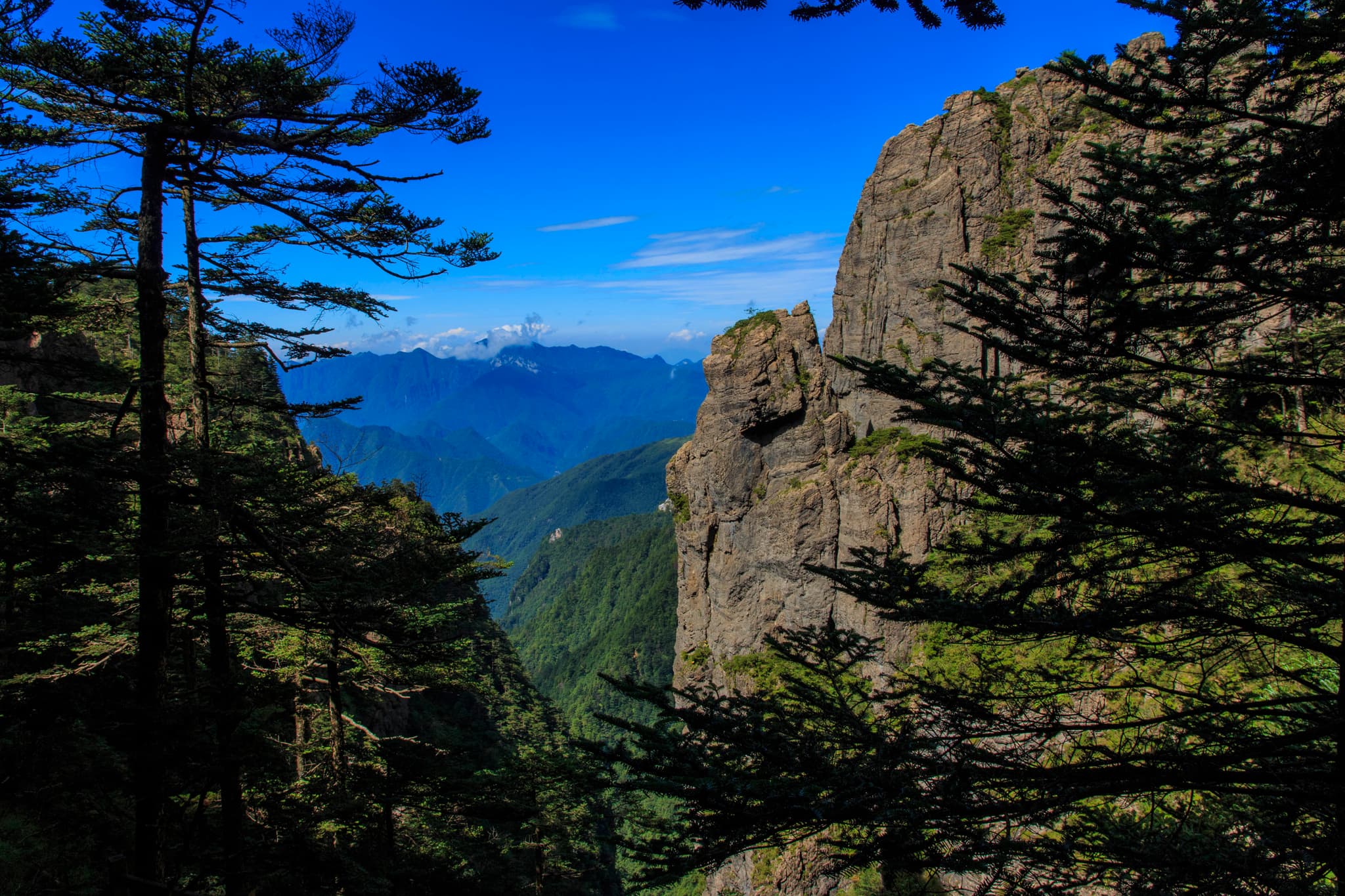 Framed by dark pine trees, a jagged stone cliff stands against a brilliant blue sky, overlooking distant, hazy mountain ridges in this dramatic natural scene.